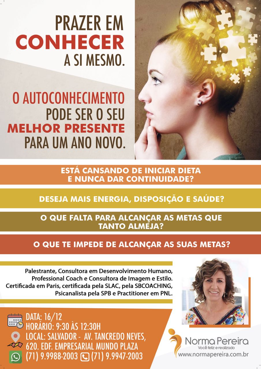O AUTOCONHECIMENTO é essencial para começar a transformação que tanto deseja e merece! Pode ser o seu melhor presente para um ano novo.Todos irão se beneficiar!Posso te levar a chegar onde quer! Esse workshop será o começo…